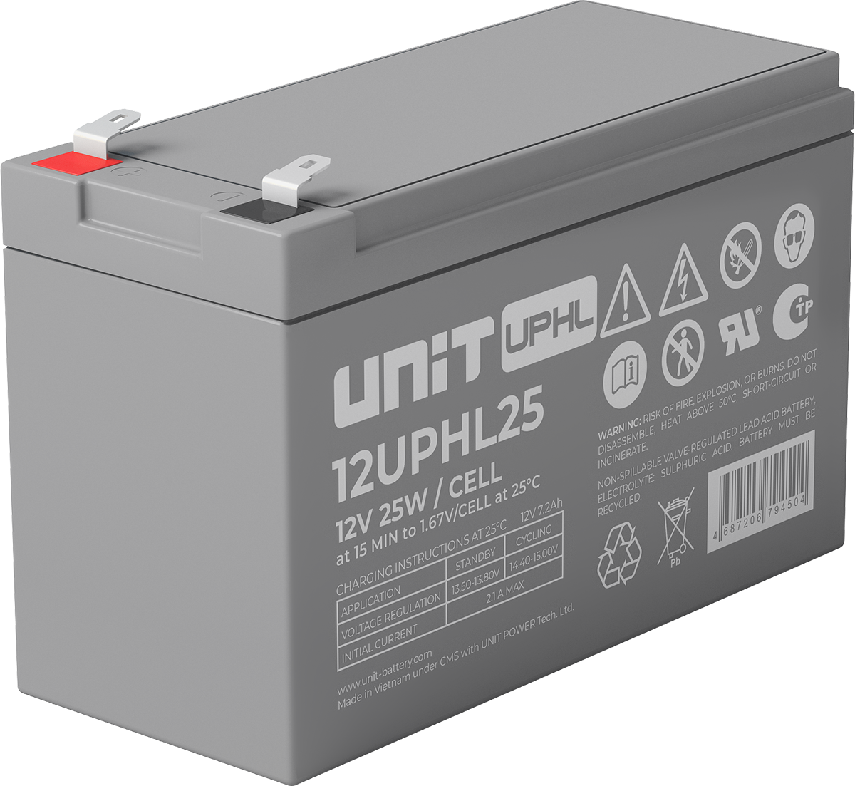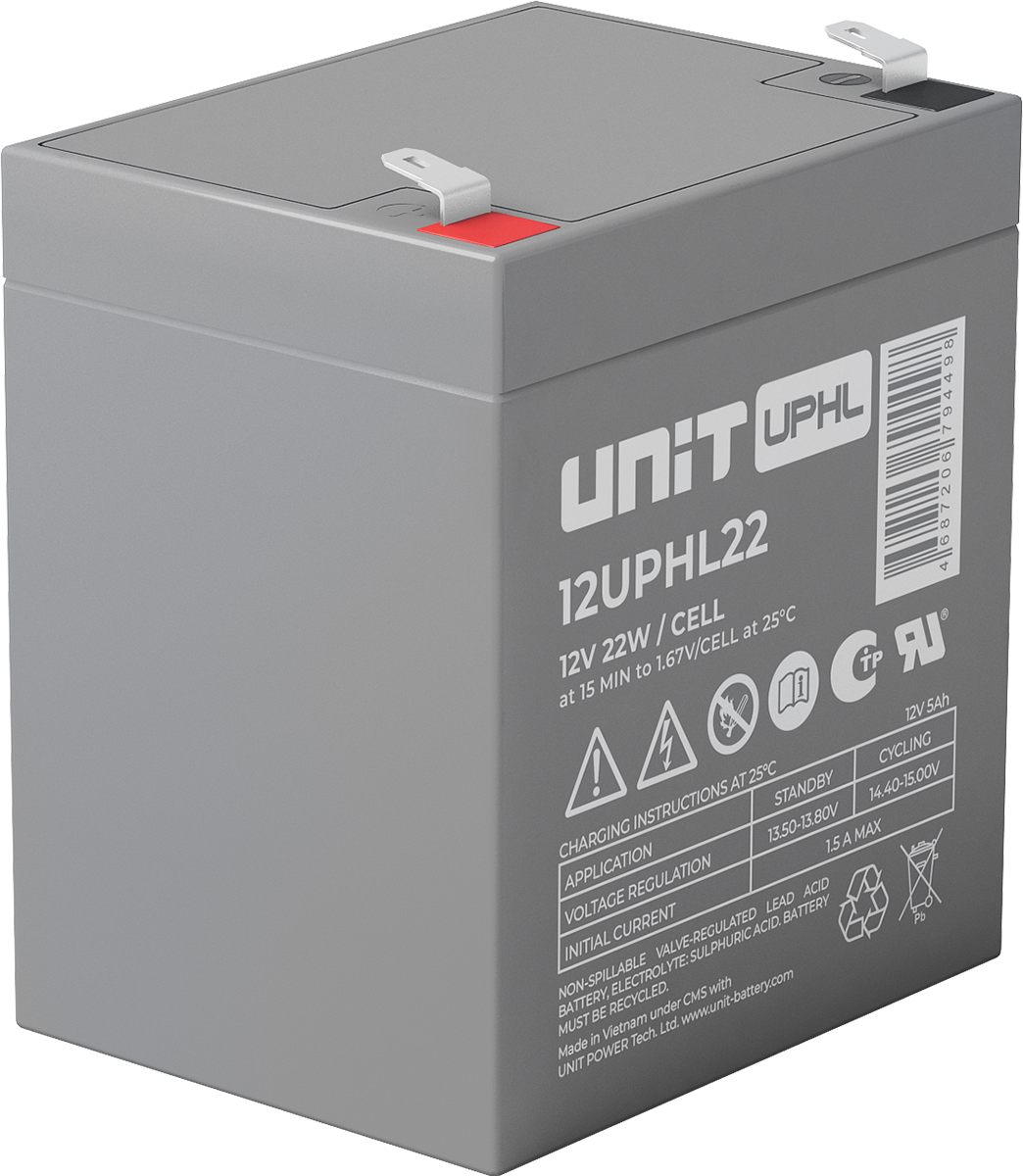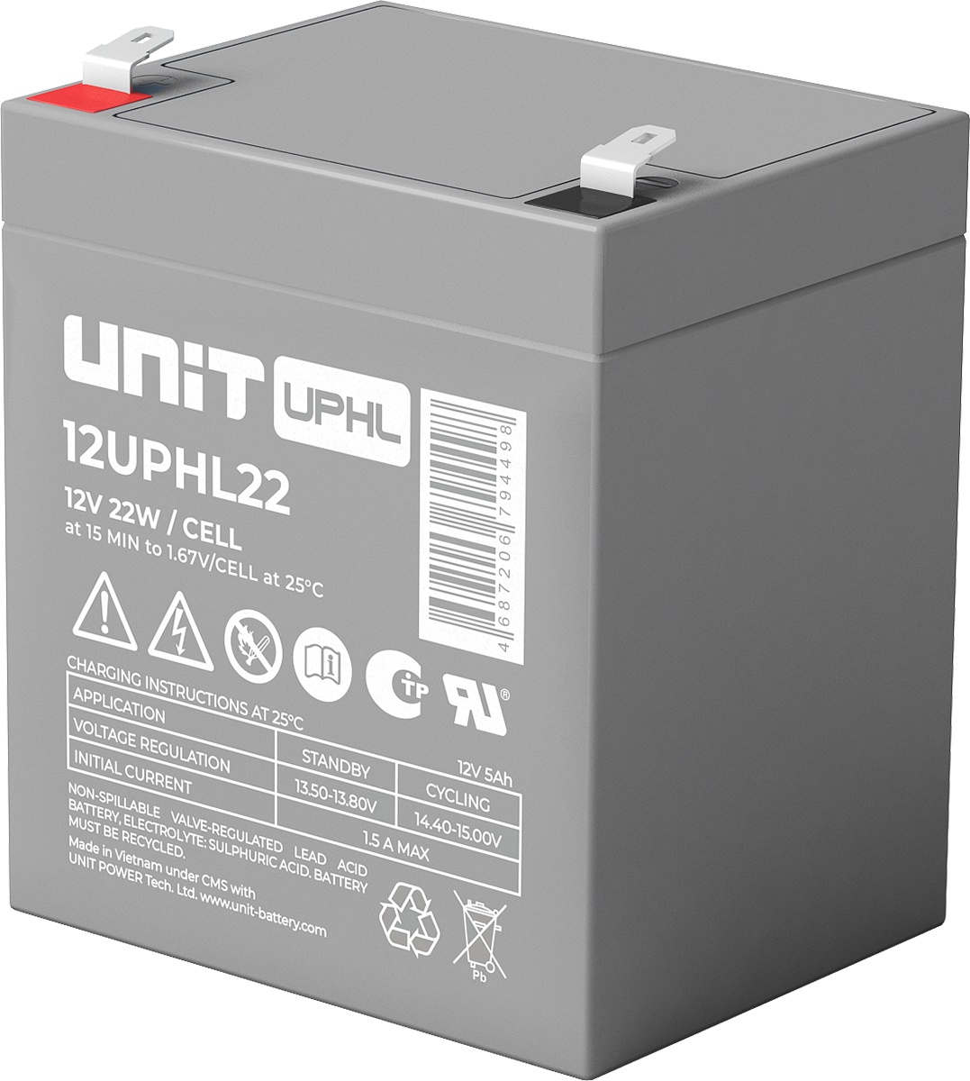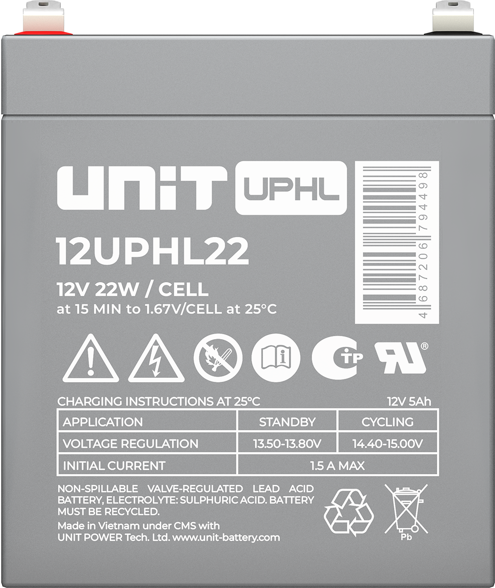 Аккумулятор UNIT 12UPHL22 стационарный свинцово кислотный, емкостью 22 Ач и напряжением 12В. Серия UPHL -с повышенной энергоотдачей с увеличенным сроком службы. Технология AGM абсолютно не содержит электролит в жидком виде, потому что он удерживается в пористом стекловолоконном сепараторе. АКБ герметизированная, эксплуатация в любом положении, не боятся опрокидывания. Система внутренней рекомбинации газов VRLA. Низкий саморазряд, корпус из негорючего материала. Никакое техническое обслуживание не требуется в течение всего времени работы. Не нужна доливка воды и постоянная проверка уровня электролита. Главной особенностью этой модели является глубокий разряд. В составе присутствует свинец высокой химической очистки и специальные присадки, в результате чего срок службы становится длиннее и составляет примерно 10-12 лет, то есть, вдвое больше обычной стандартной батареи