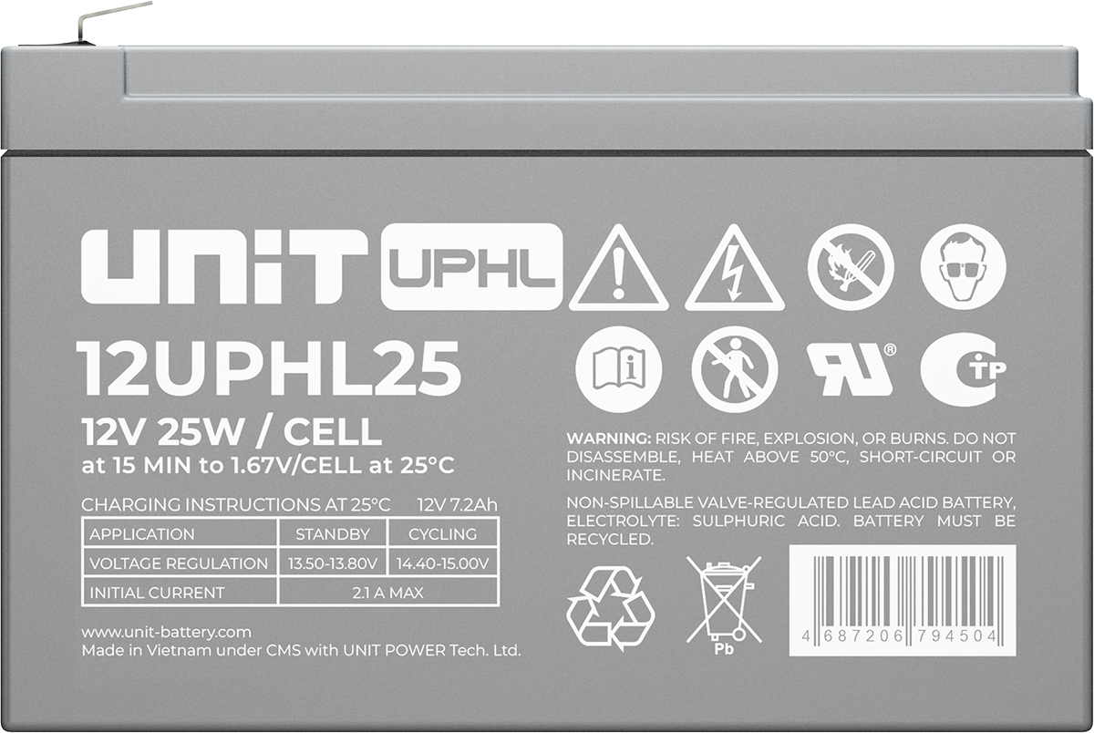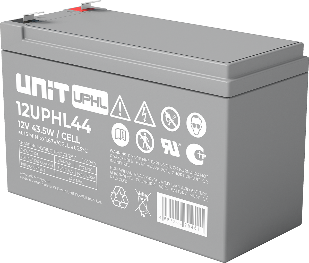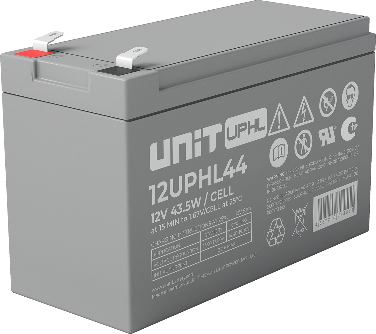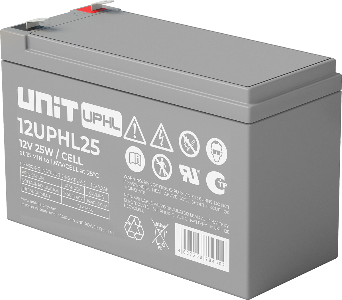 Аккумулятор UNIT 12UPHL22 стационарный свинцово кислотный, емкостью 22 Ач и напряжением 12В. Серия UPHL -с повышенной энергоотдачей с увеличенным сроком службы. Технология AGM абсолютно не содержит электролит в жидком виде, потому что он удерживается в пористом стекловолоконном сепараторе. АКБ герметизированная, эксплуатация в любом положении, не боятся опрокидывания. Система внутренней рекомбинации газов VRLA. Низкий саморазряд, корпус из негорючего материала. Никакое техническое обслуживание не требуется в течение всего времени работы. Не нужна доливка воды и постоянная проверка уровня электролита. Главной особенностью этой модели является глубокий разряд. В составе присутствует свинец высокой химической очистки и специальные присадки, в результате чего срок службы становится длиннее и составляет примерно 10-12 лет, то есть, вдвое больше обычной стандартной батареи