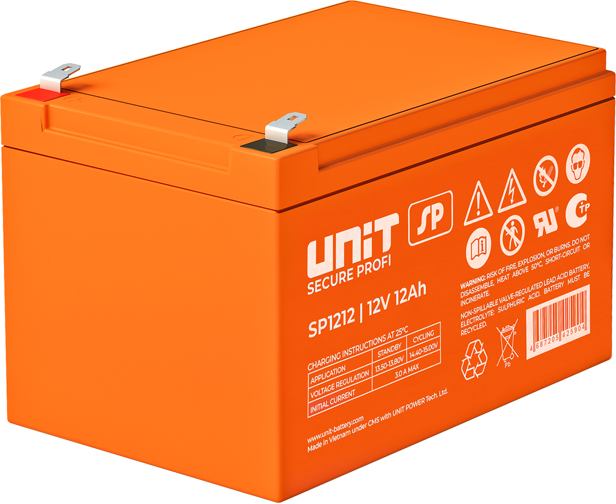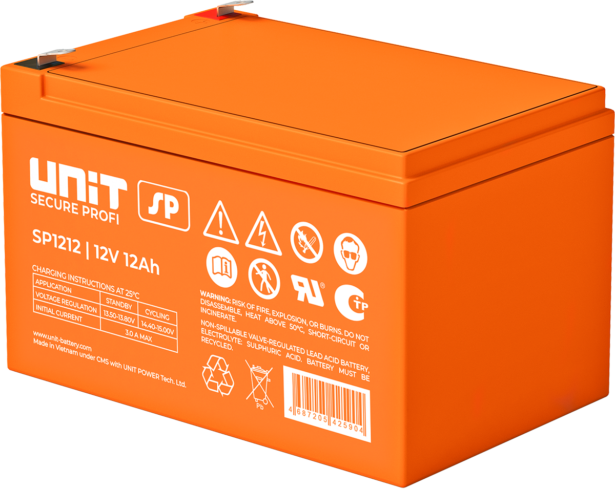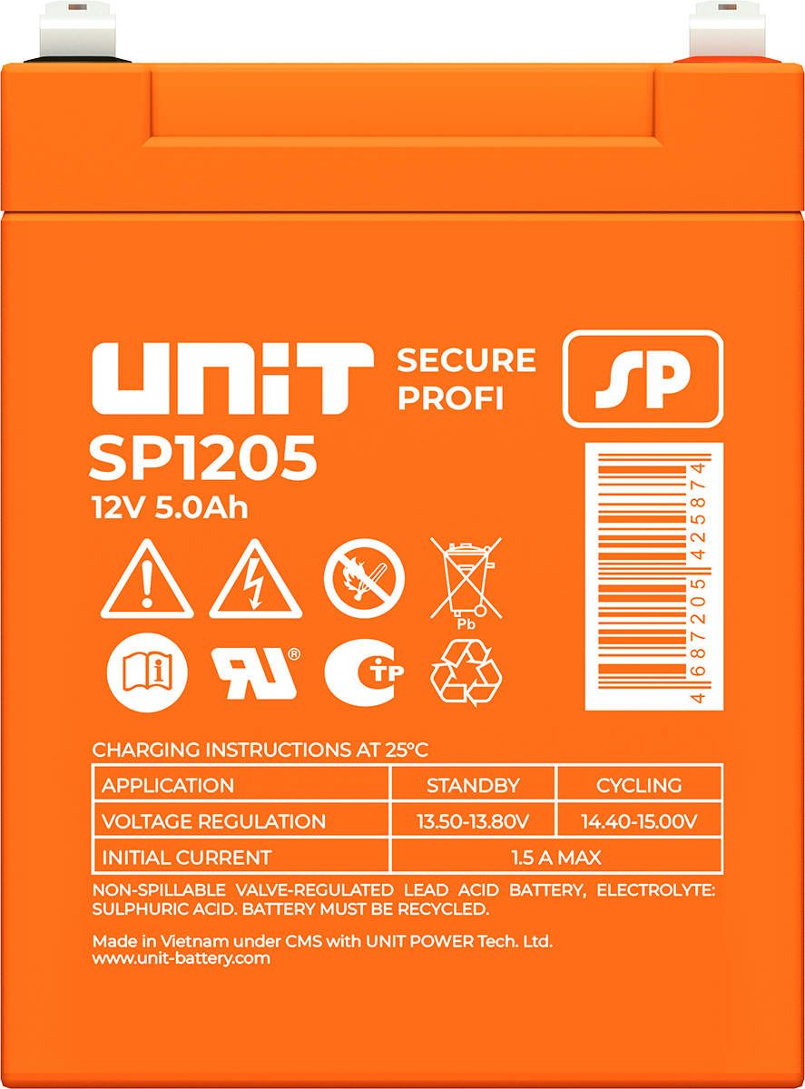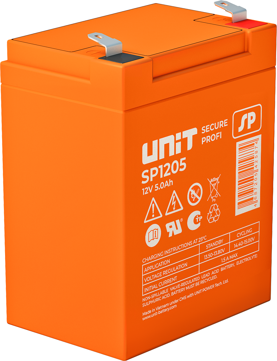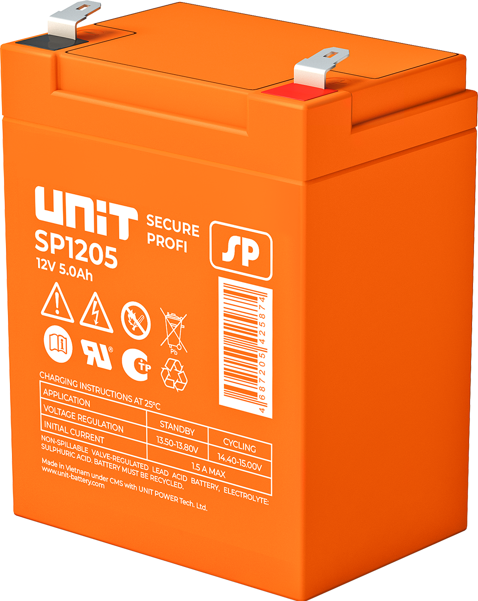 Аккумулятор UNIT SP-1205 стационарный свинцово кислотный, емкостью 5 Ач и напряжением 12В. Серия SP - универсальные, стандартные. Технология AGM абсолютно не содержит электролит в жидком виде, потому что он удерживается в пористом стекловолоконном сепараторе. АКБ герметизированная, эксплуатация в любом положении, не боятся опрокидывания. Система внутренней рекомбинации газов VRLA. Низкий саморазряд, корпус из негорючего материала. Никакое техническое обслуживание не требуется в течение всего времени работы. Не нужна доливка воды и постоянная проверка уровня электролита. Главной особенностью этой модели является глубокий разряд. В составе присутствует свинец высокой химической очистки и специальные присадки, в результате чего срок службы становится длиннее и составляет примерно 3-5 лет, то есть, вдвое больше обычной стандартной батареи