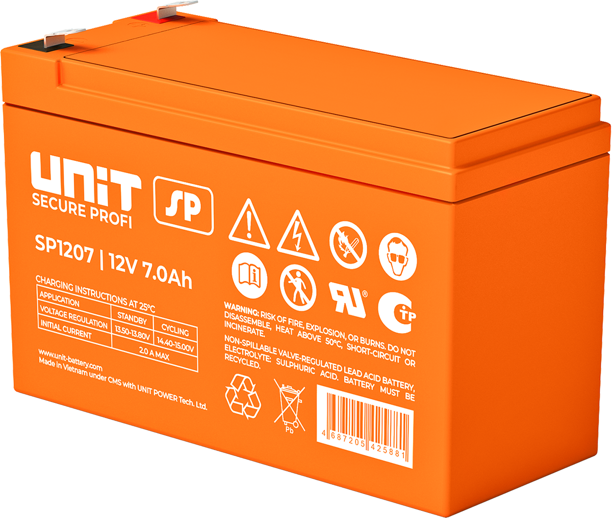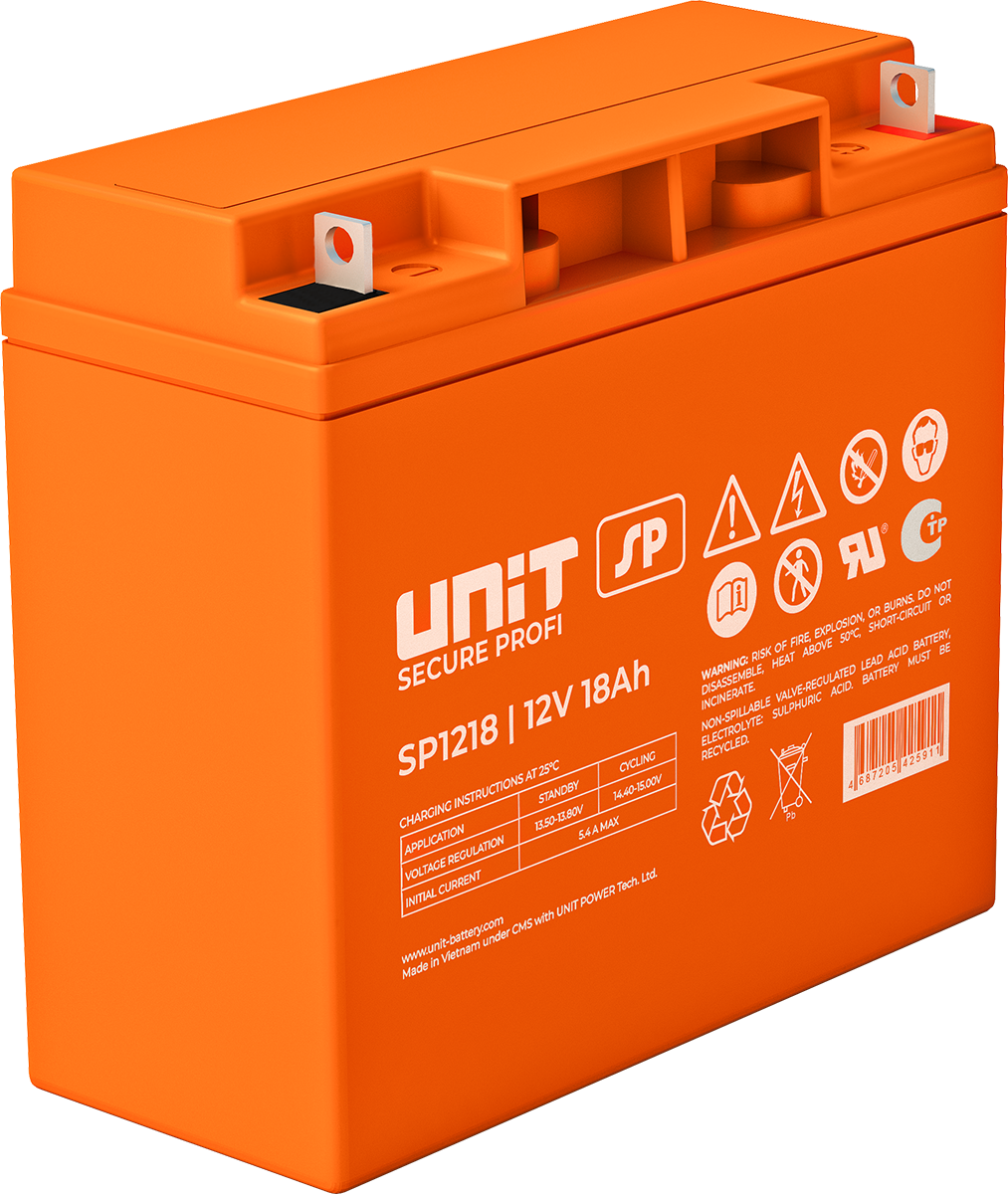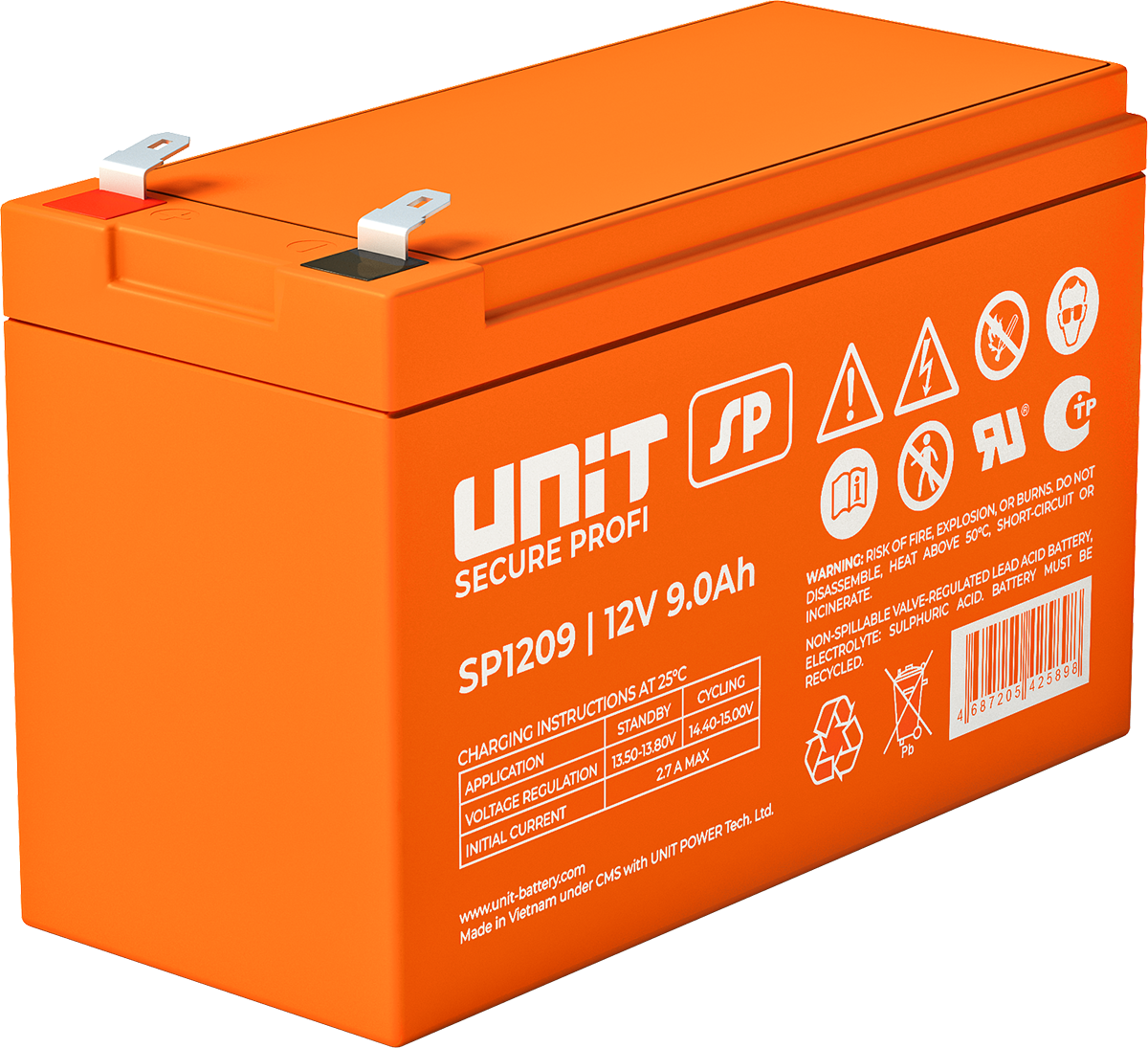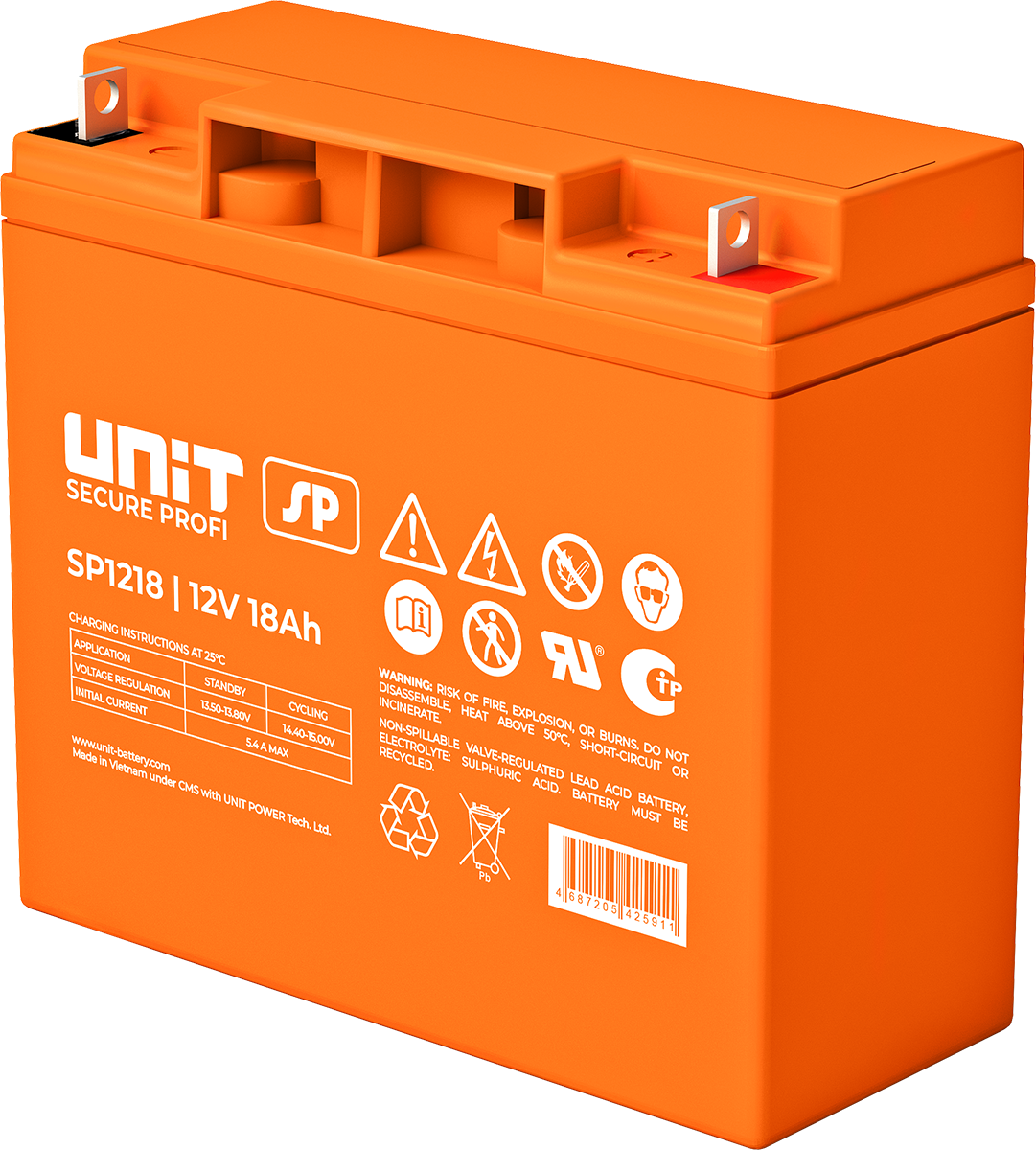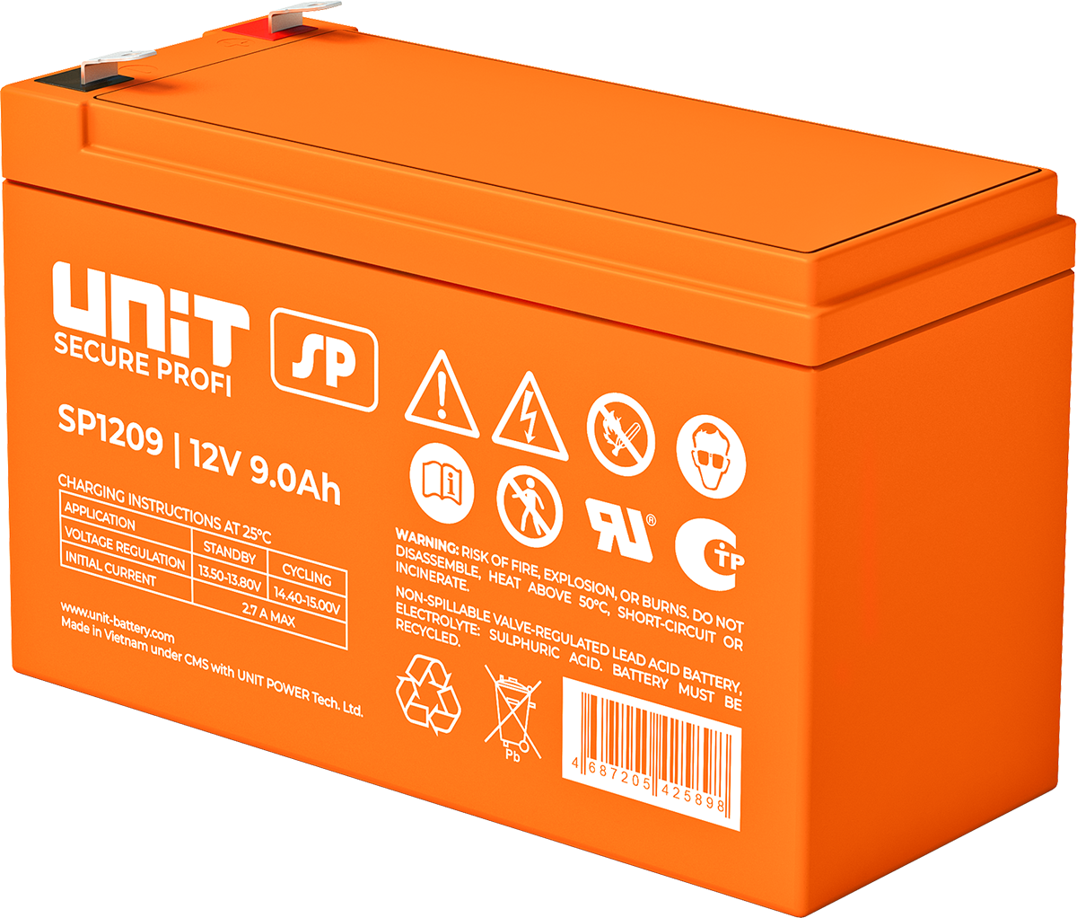 Аккумулятор UNIT SP-1205 стационарный свинцово кислотный, емкостью 5 Ач и напряжением 12В. Серия SP - универсальные, стандартные. Технология AGM абсолютно не содержит электролит в жидком виде, потому что он удерживается в пористом стекловолоконном сепараторе. АКБ герметизированная, эксплуатация в любом положении, не боятся опрокидывания. Система внутренней рекомбинации газов VRLA. Низкий саморазряд, корпус из негорючего материала. Никакое техническое обслуживание не требуется в течение всего времени работы. Не нужна доливка воды и постоянная проверка уровня электролита. Главной особенностью этой модели является глубокий разряд. В составе присутствует свинец высокой химической очистки и специальные присадки, в результате чего срок службы становится длиннее и составляет примерно 3-5 лет, то есть, вдвое больше обычной стандартной батареи