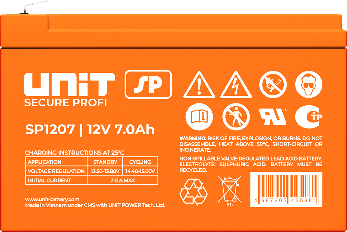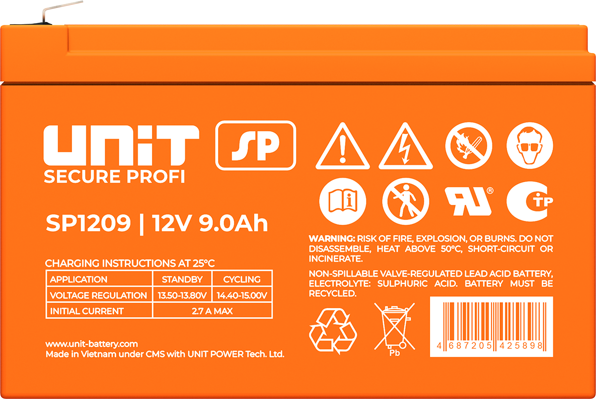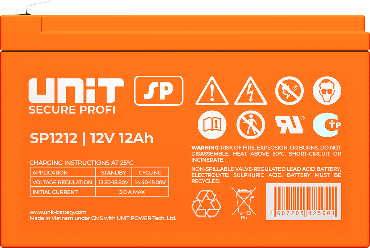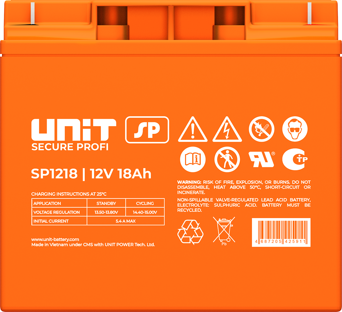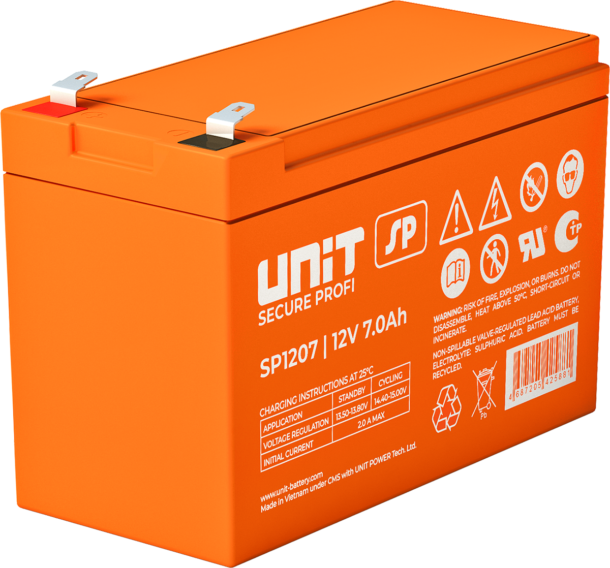 Аккумулятор UNIT SP-1205 стационарный свинцово кислотный, емкостью 5 Ач и напряжением 12В. Серия SP - универсальные, стандартные. Технология AGM абсолютно не содержит электролит в жидком виде, потому что он удерживается в пористом стекловолоконном сепараторе. АКБ герметизированная, эксплуатация в любом положении, не боятся опрокидывания. Система внутренней рекомбинации газов VRLA. Низкий саморазряд, корпус из негорючего материала. Никакое техническое обслуживание не требуется в течение всего времени работы. Не нужна доливка воды и постоянная проверка уровня электролита. Главной особенностью этой модели является глубокий разряд. В составе присутствует свинец высокой химической очистки и специальные присадки, в результате чего срок службы становится длиннее и составляет примерно 3-5 лет, то есть, вдвое больше обычной стандартной батареи