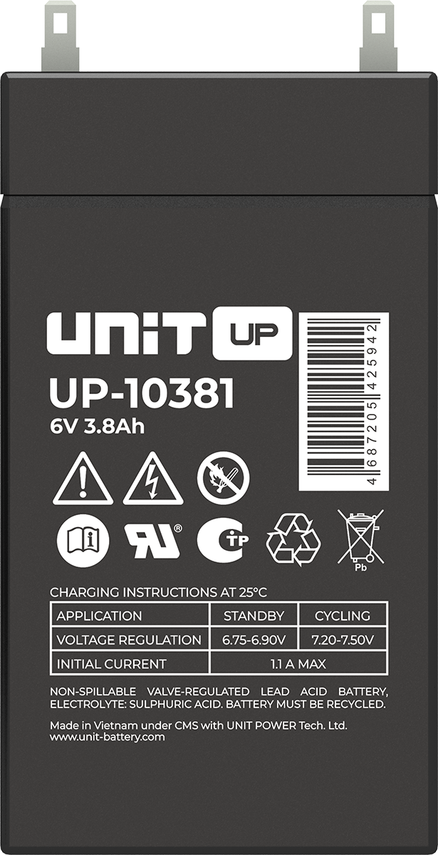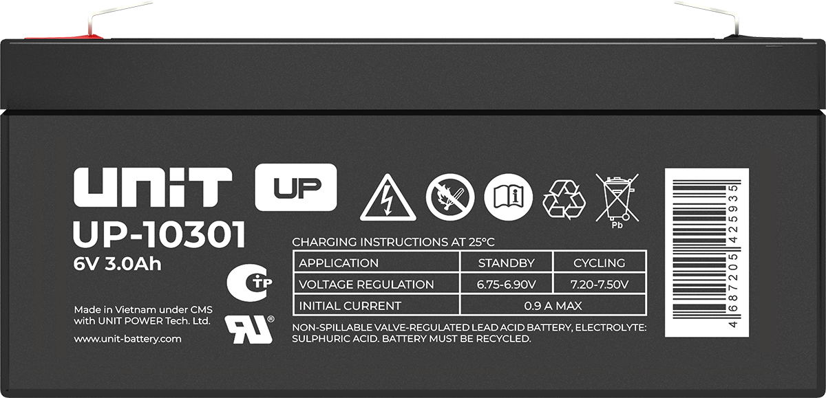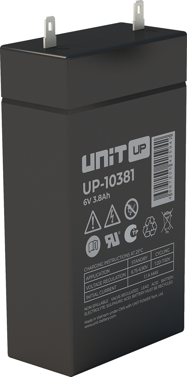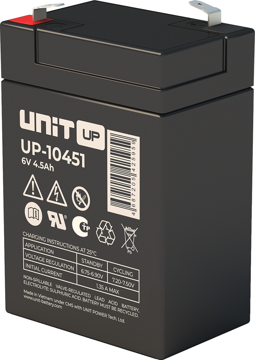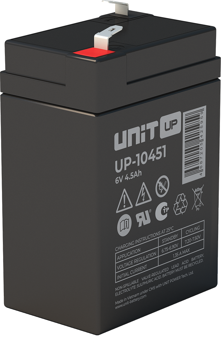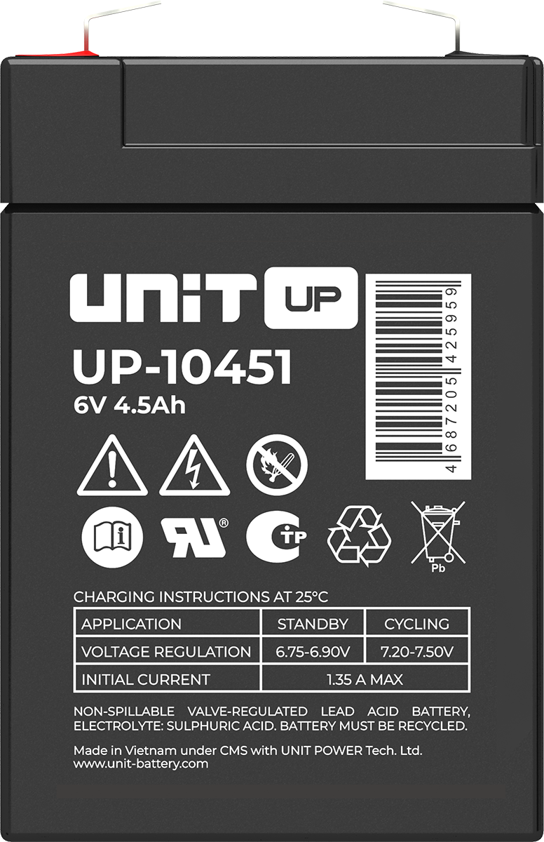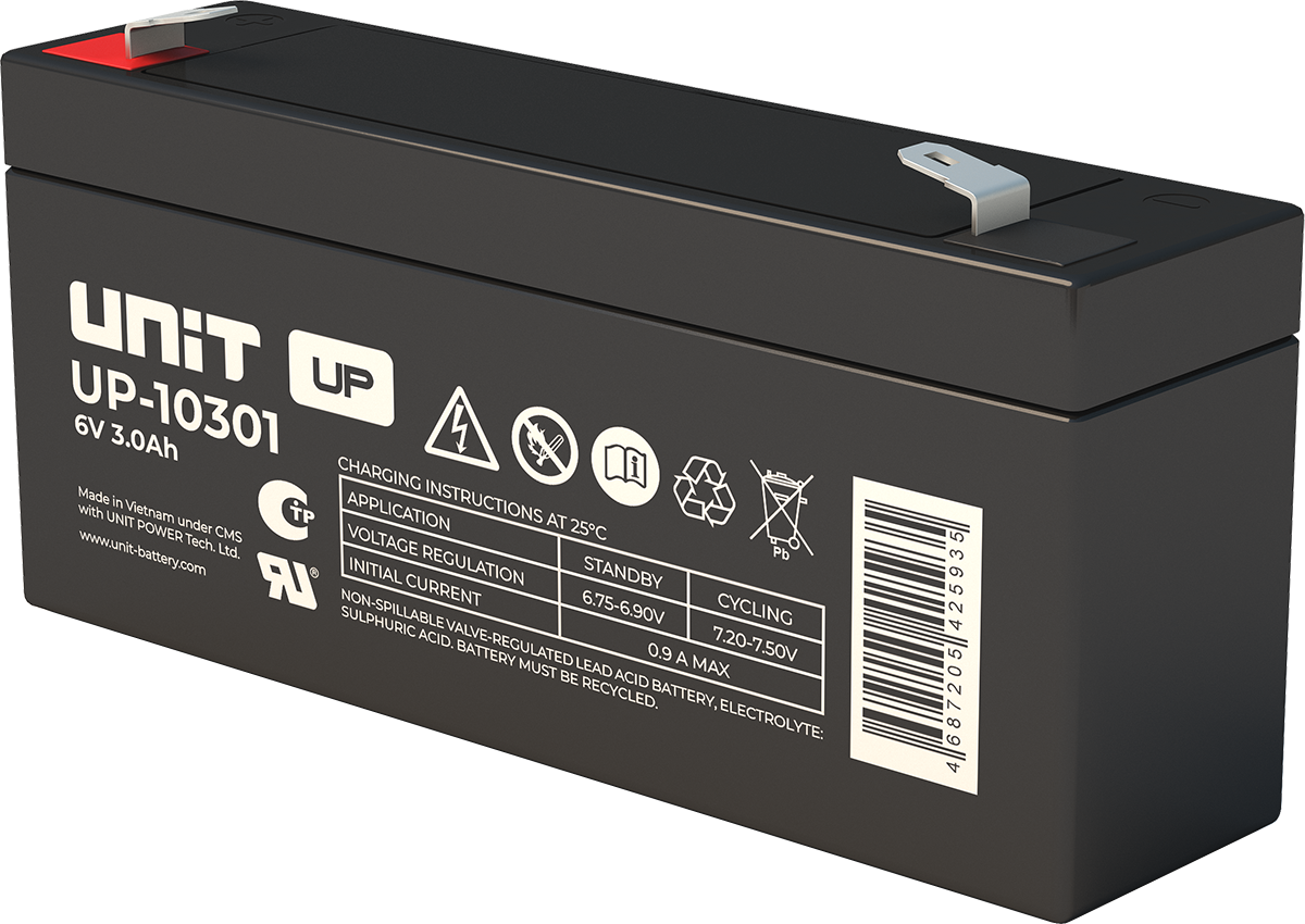 Аккумулятор UNIT UP-10301 стационарный свинцово кислотный, емкостью 3 Ач и напряжением 6В. Серия UP - универсальные, стандартные. Технология AGM абсолютно не содержит электролит в жидком виде, потому что он удерживается в пористом стекловолоконном сепараторе. АКБ герметизированная, эксплуатация в любом положении, не боятся опрокидывания. Система внутренней рекомбинации газов VRLA. Низкий саморазряд, корпус из негорючего материала. Никакое техническое обслуживание не требуется в течение всего времени работы. Не нужна доливка воды и постоянная проверка уровня электролита. Главной особенностью этой модели является глубокий разряд. В составе присутствует свинец высокой химической очистки и специальные присадки, в результате чего срок службы становится длиннее и составляет примерно 6-8 лет, то есть, вдвое больше обычной стандартной батареи