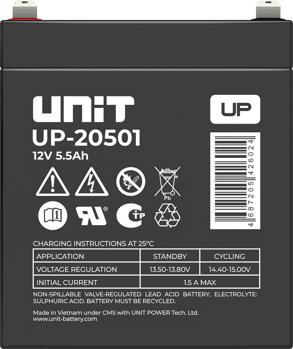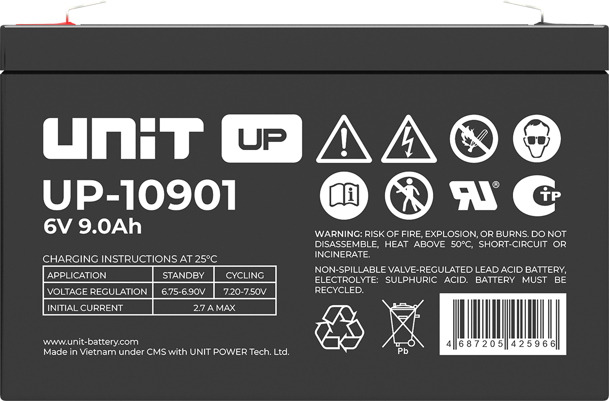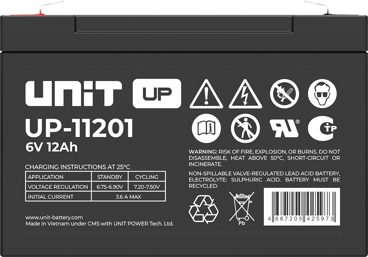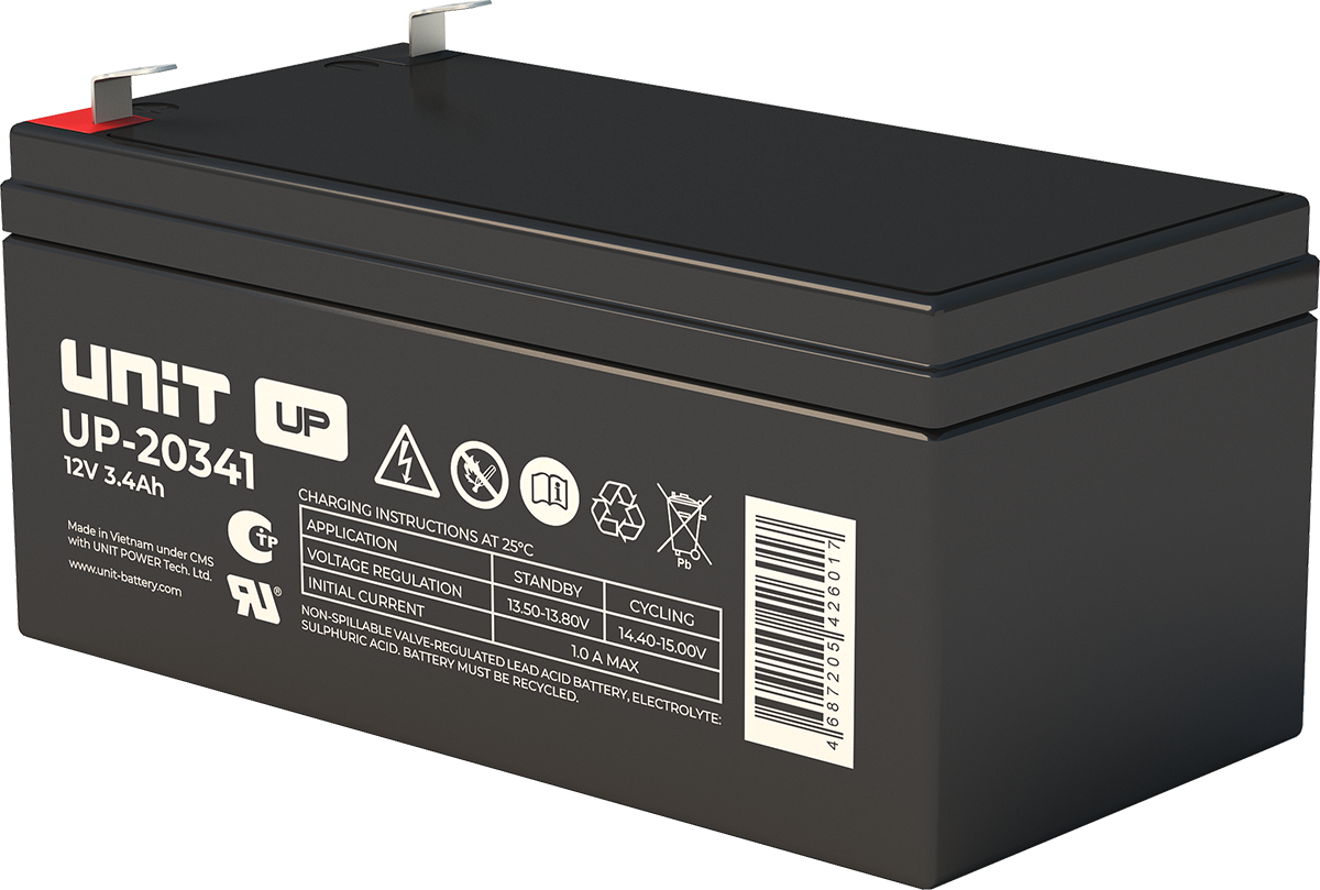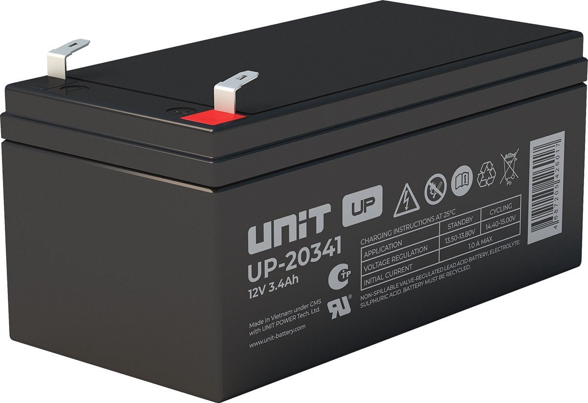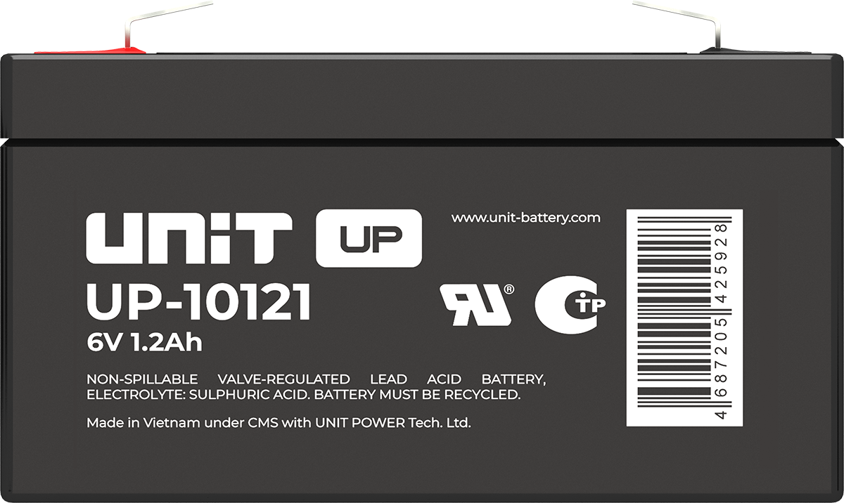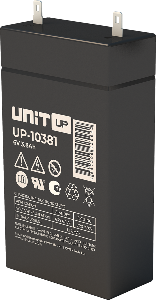Аккумулятор UNIT UP-10301 стационарный свинцово кислотный, емкостью 3 Ач и напряжением 6В. Серия UP - универсальные, стандартные. Технология AGM абсолютно не содержит электролит в жидком виде, потому что он удерживается в пористом стекловолоконном сепараторе. АКБ герметизированная, эксплуатация в любом положении, не боятся опрокидывания. Система внутренней рекомбинации газов VRLA. Низкий саморазряд, корпус из негорючего материала. Никакое техническое обслуживание не требуется в течение всего времени работы. Не нужна доливка воды и постоянная проверка уровня электролита. Главной особенностью этой модели является глубокий разряд. В составе присутствует свинец высокой химической очистки и специальные присадки, в результате чего срок службы становится длиннее и составляет примерно 6-8 лет, то есть, вдвое больше обычной стандартной батареи