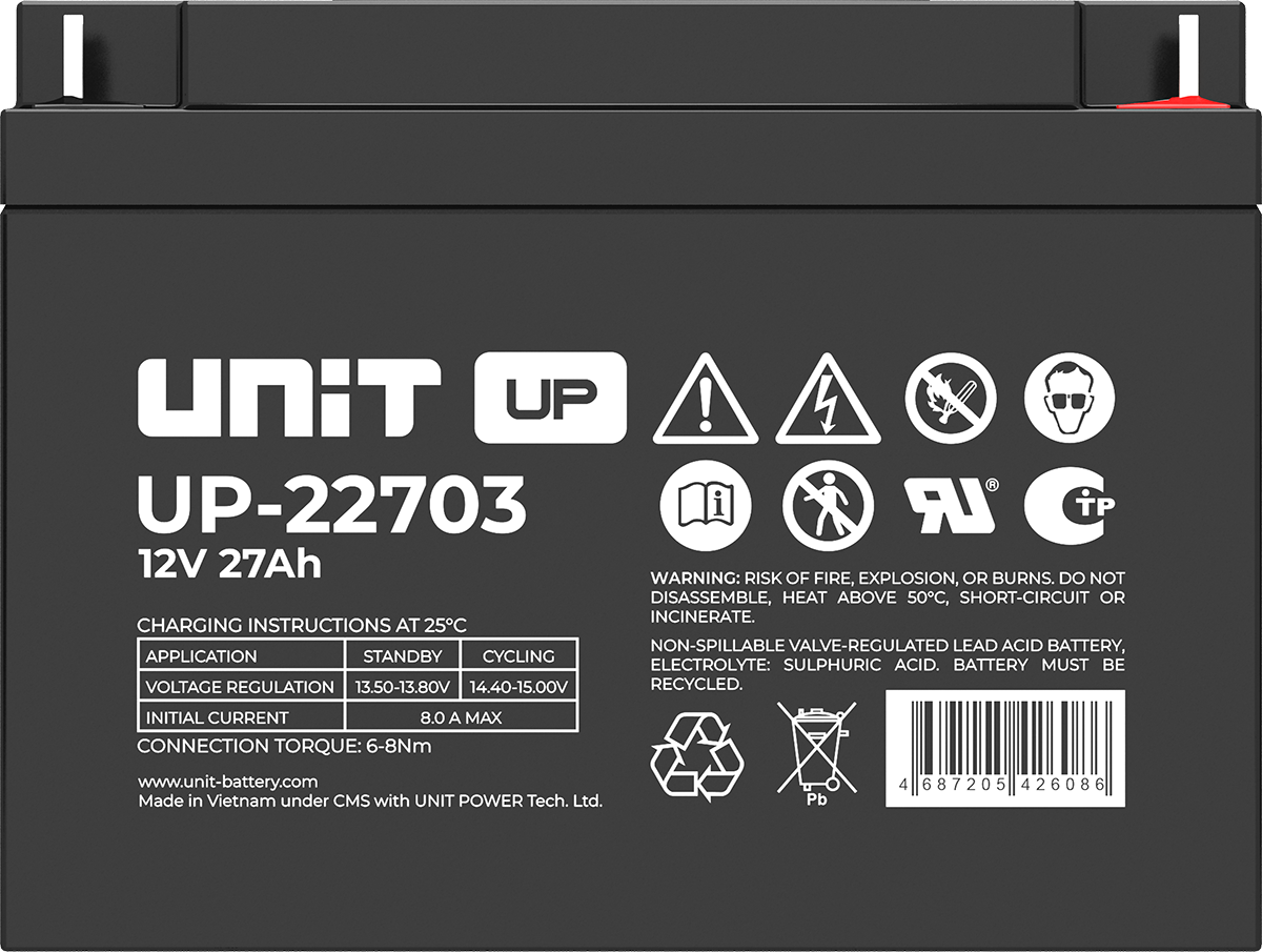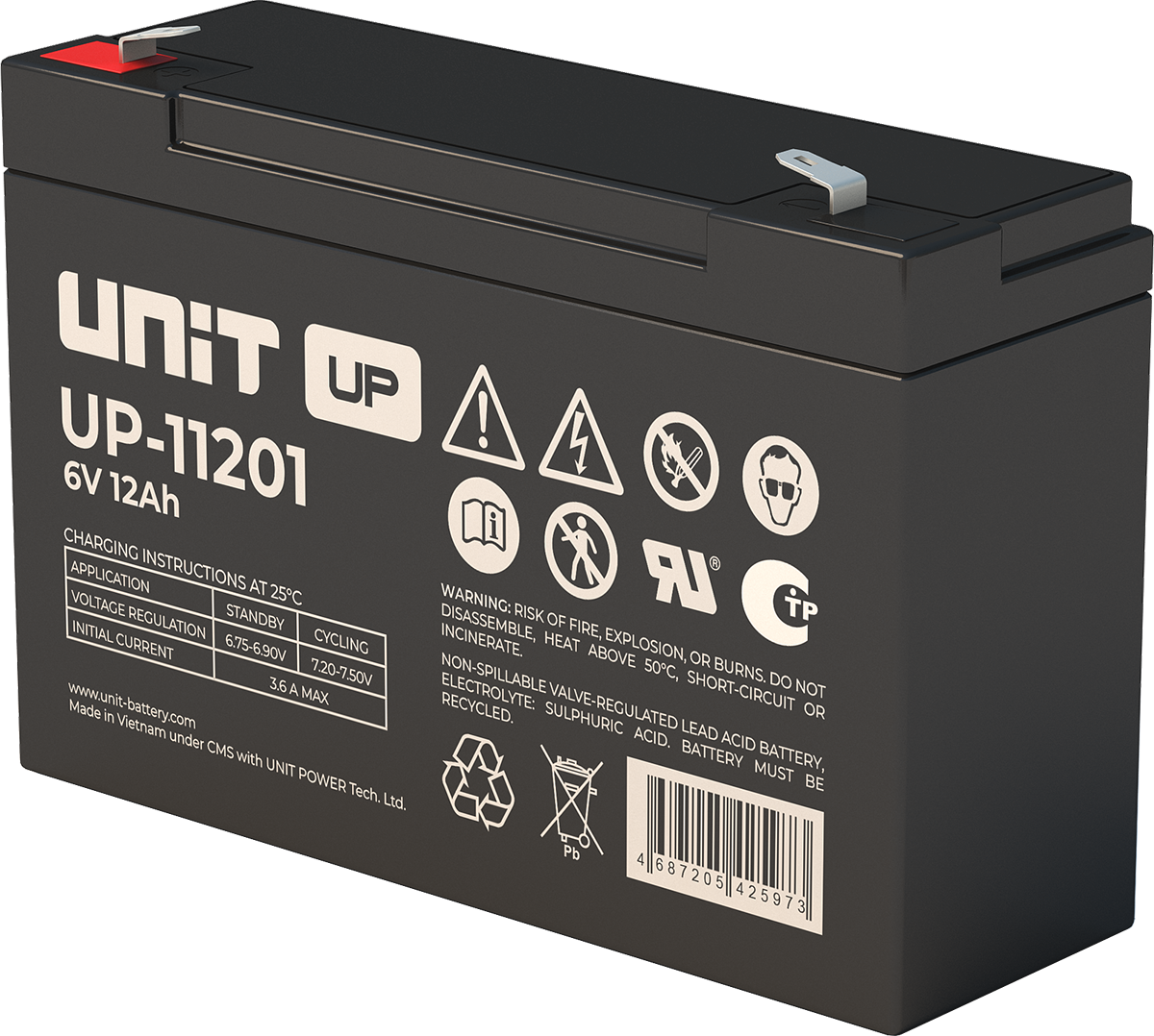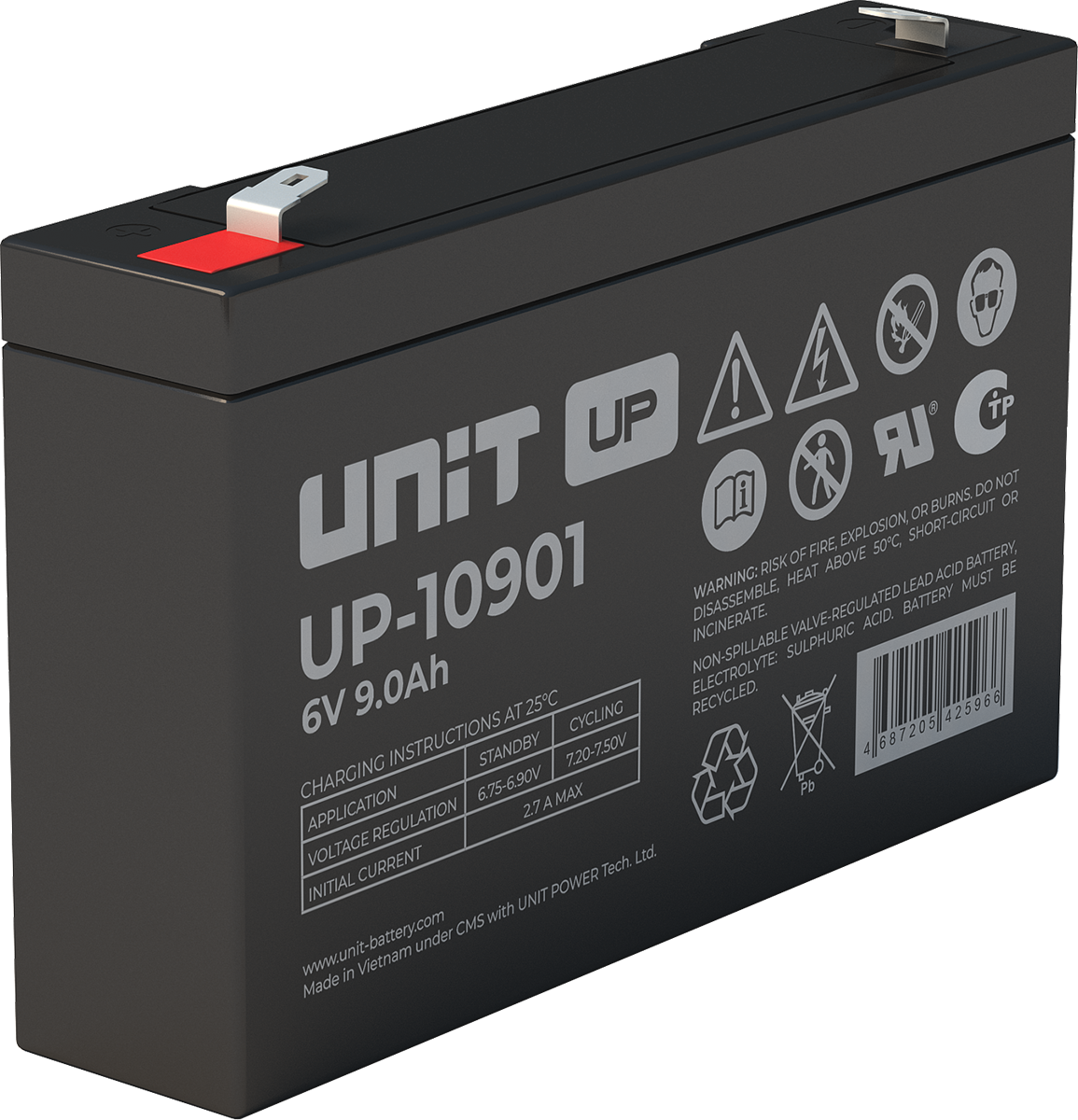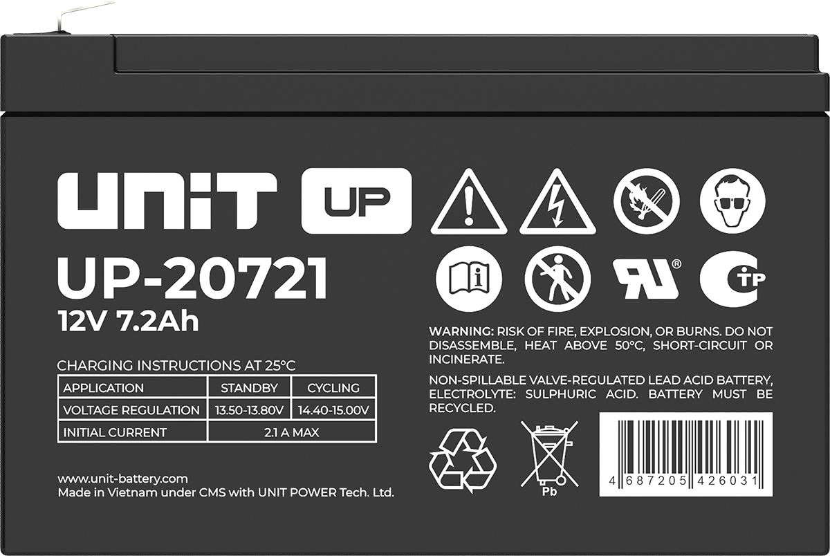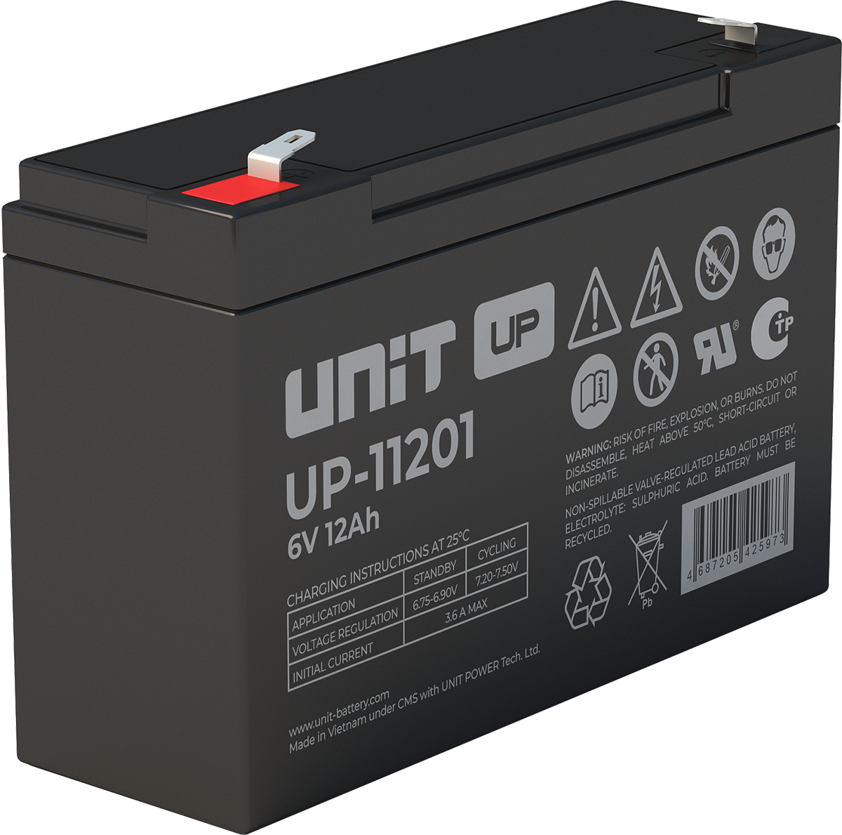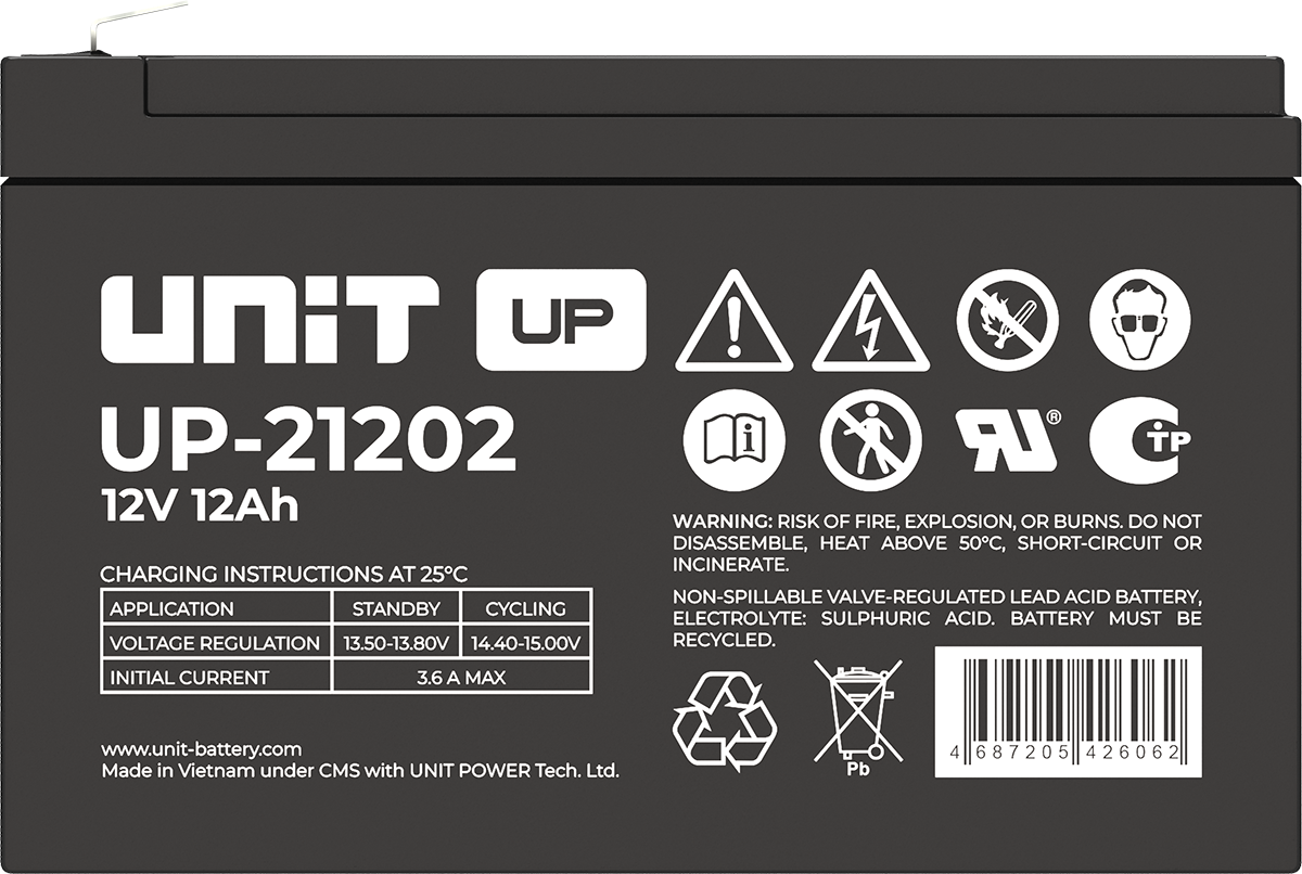 Аккумулятор UNIT UP-10301 стационарный свинцово кислотный, емкостью 3 Ач и напряжением 6В. Серия UP - универсальные, стандартные. Технология AGM абсолютно не содержит электролит в жидком виде, потому что он удерживается в пористом стекловолоконном сепараторе. АКБ герметизированная, эксплуатация в любом положении, не боятся опрокидывания. Система внутренней рекомбинации газов VRLA. Низкий саморазряд, корпус из негорючего материала. Никакое техническое обслуживание не требуется в течение всего времени работы. Не нужна доливка воды и постоянная проверка уровня электролита. Главной особенностью этой модели является глубокий разряд. В составе присутствует свинец высокой химической очистки и специальные присадки, в результате чего срок службы становится длиннее и составляет примерно 6-8 лет, то есть, вдвое больше обычной стандартной батареи