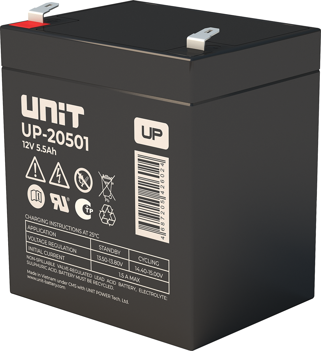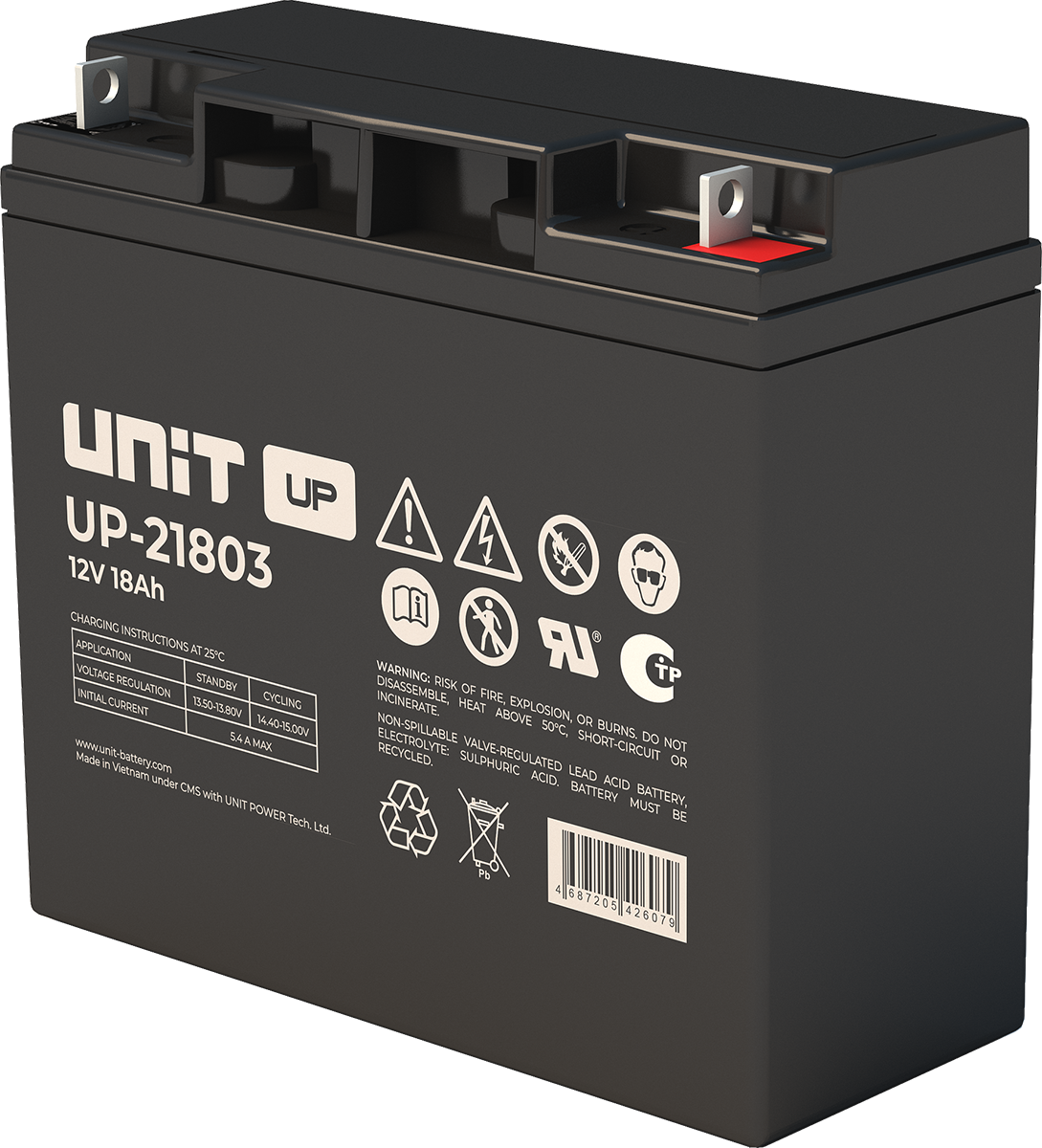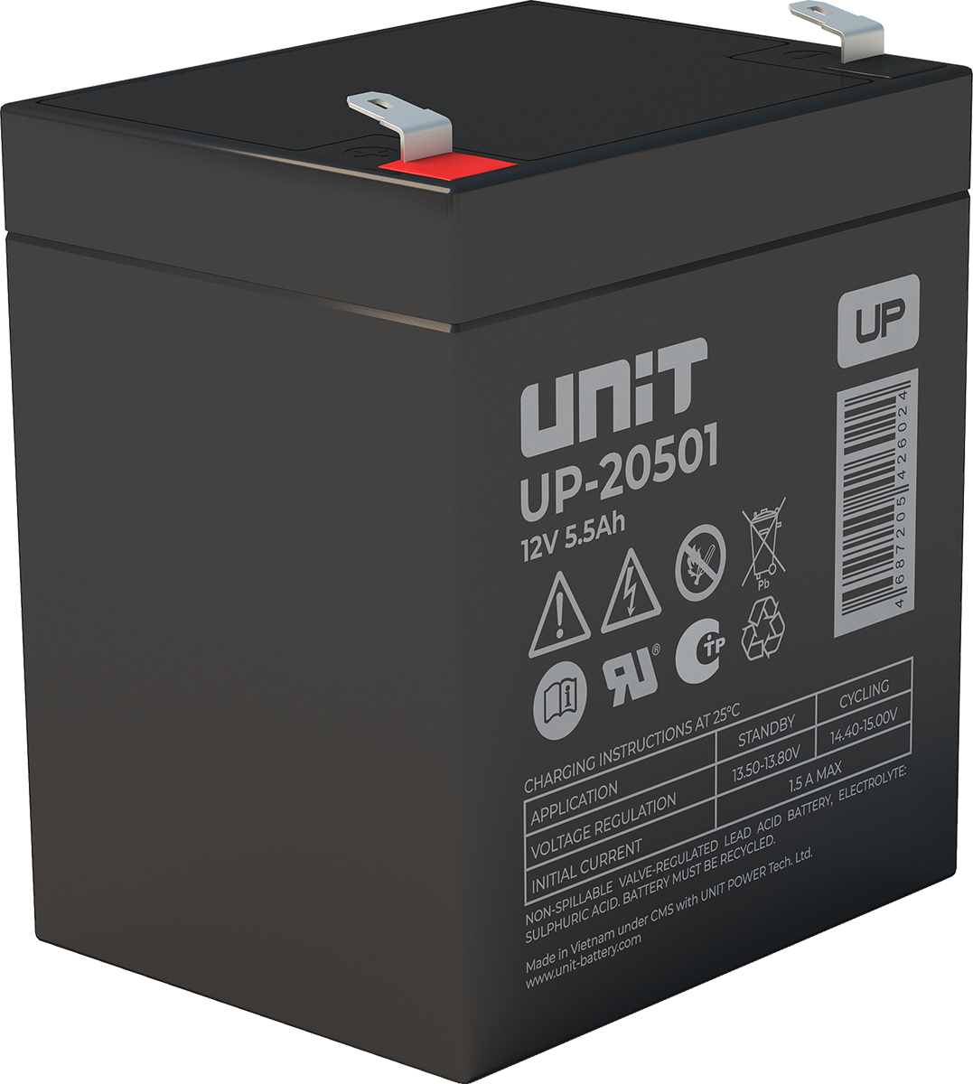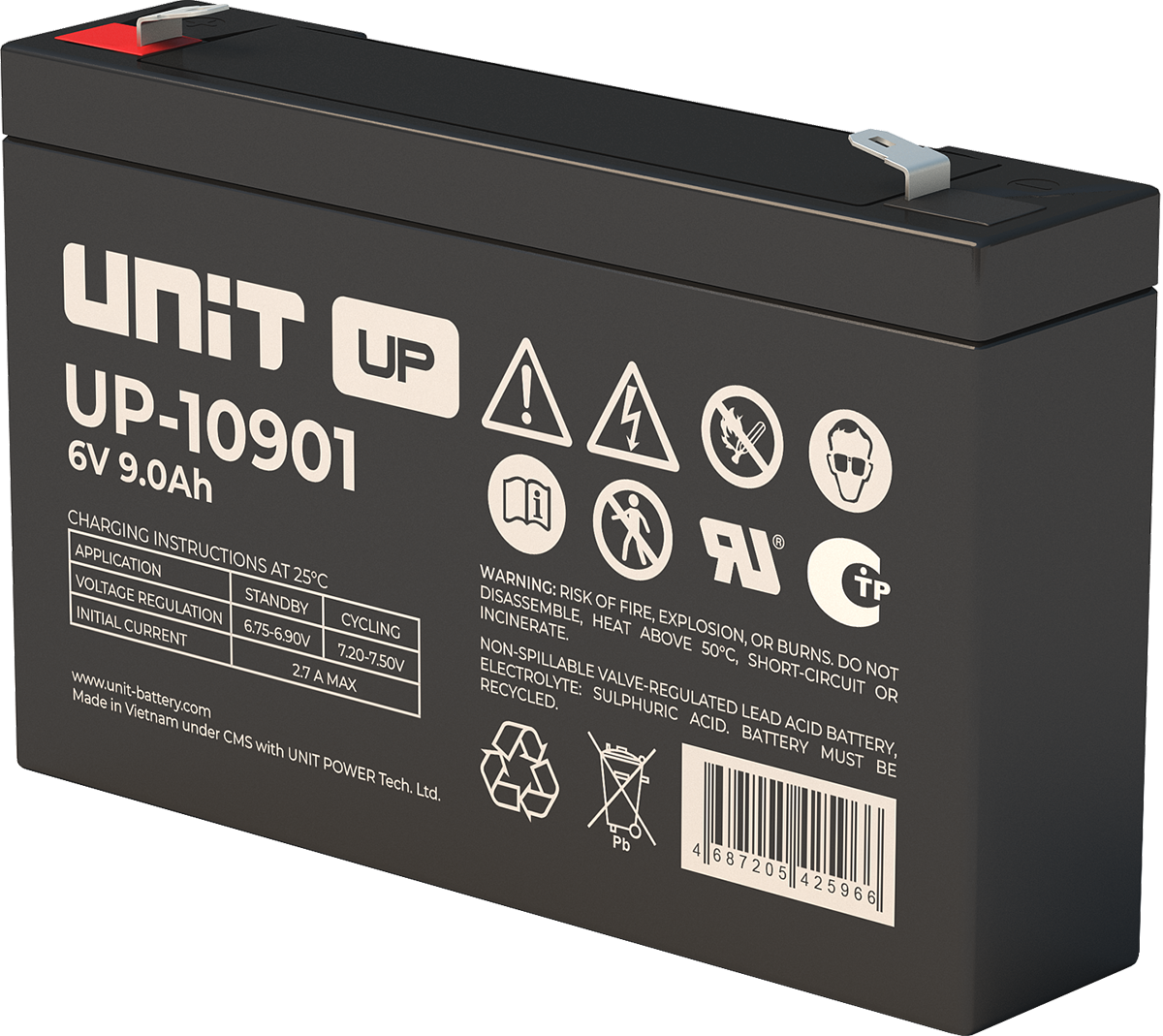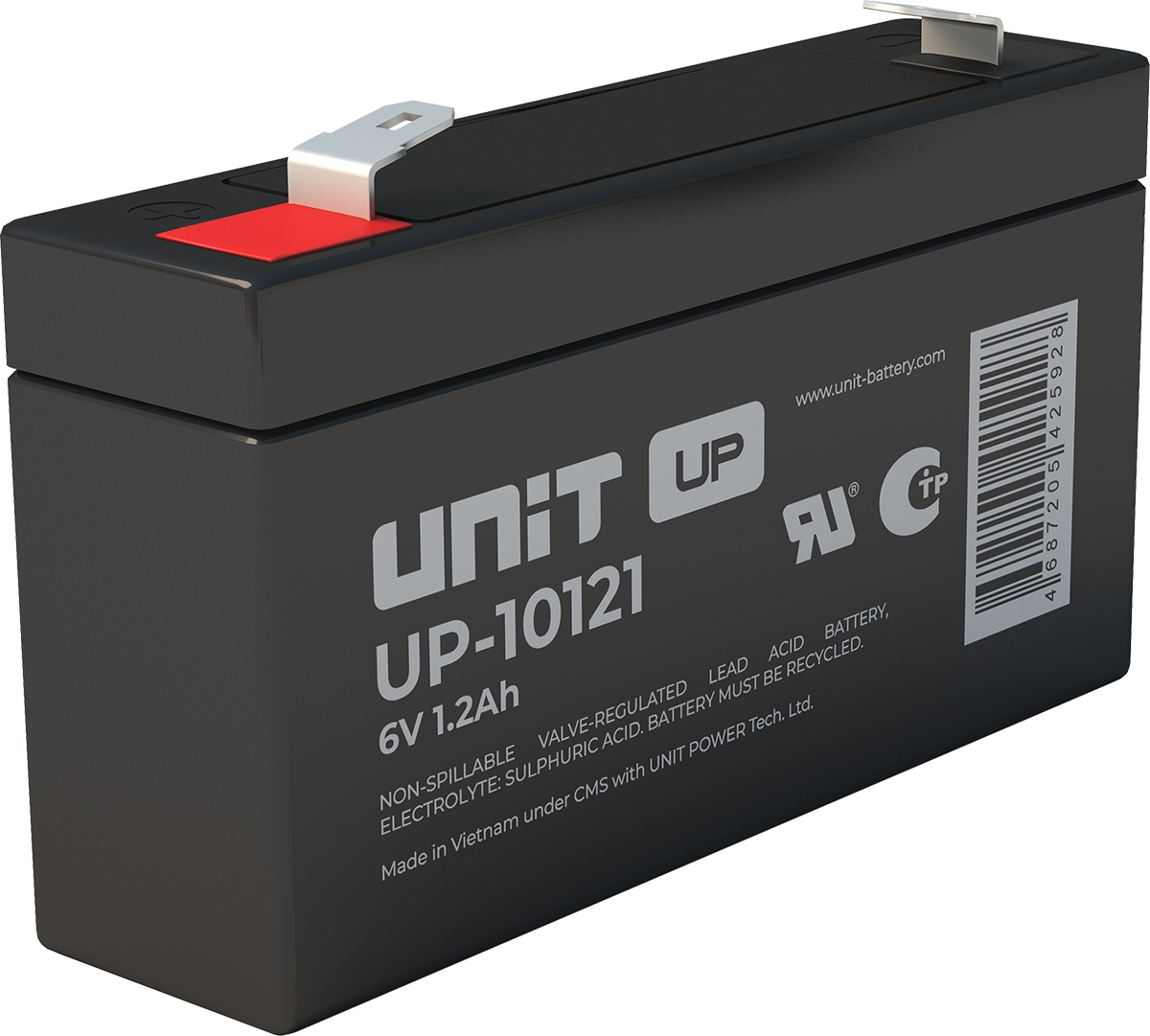Аккумулятор UNIT UP-10301 стационарный свинцово кислотный, емкостью 3 Ач и напряжением 6В. Серия UP - универсальные, стандартные. Технология AGM абсолютно не содержит электролит в жидком виде, потому что он удерживается в пористом стекловолоконном сепараторе. АКБ герметизированная, эксплуатация в любом положении, не боятся опрокидывания. Система внутренней рекомбинации газов VRLA. Низкий саморазряд, корпус из негорючего материала. Никакое техническое обслуживание не требуется в течение всего времени работы. Не нужна доливка воды и постоянная проверка уровня электролита. Главной особенностью этой модели является глубокий разряд. В составе присутствует свинец высокой химической очистки и специальные присадки, в результате чего срок службы становится длиннее и составляет примерно 6-8 лет, то есть, вдвое больше обычной стандартной батареи