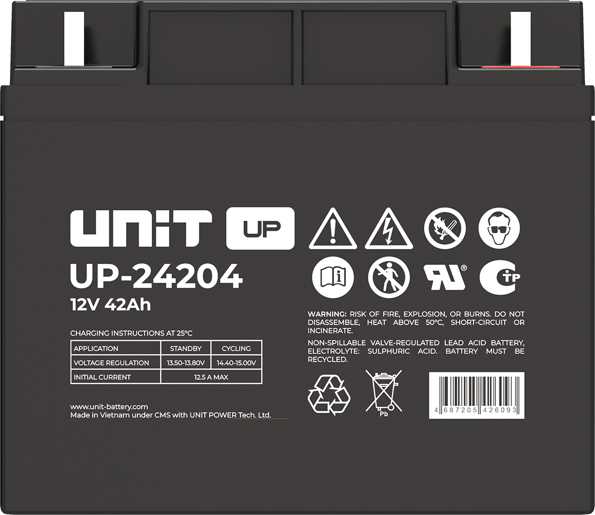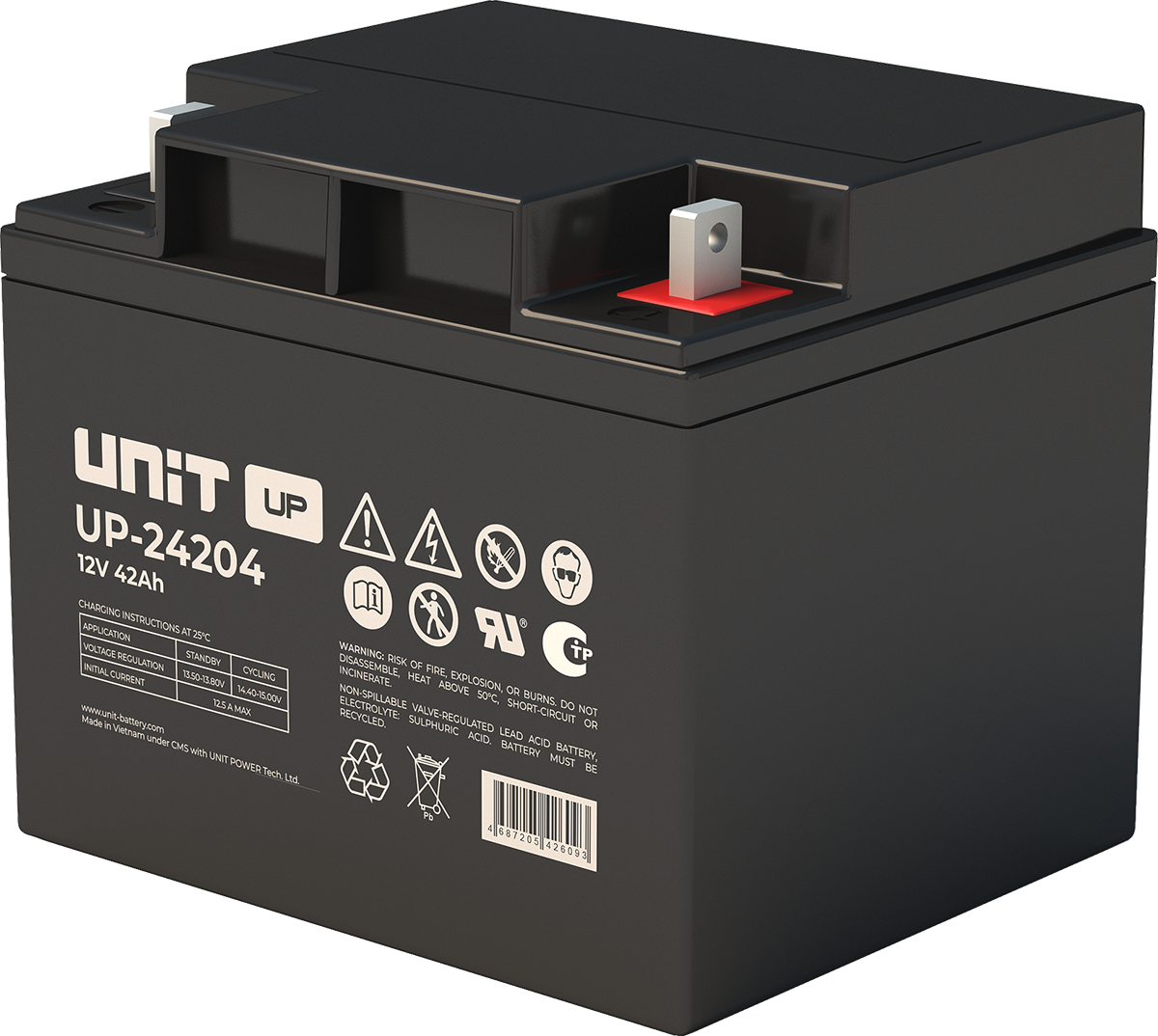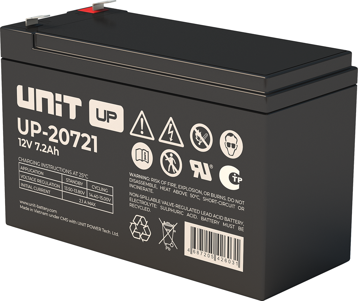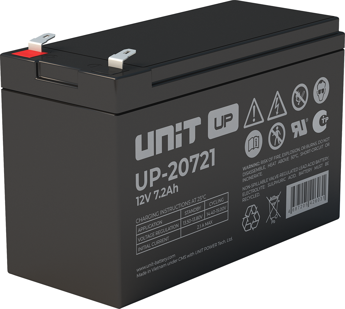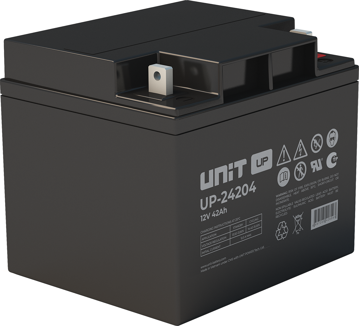 Аккумулятор UNIT UP-10301 стационарный свинцово кислотный, емкостью 3 Ач и напряжением 6В. Серия UP - универсальные, стандартные. Технология AGM абсолютно не содержит электролит в жидком виде, потому что он удерживается в пористом стекловолоконном сепараторе. АКБ герметизированная, эксплуатация в любом положении, не боятся опрокидывания. Система внутренней рекомбинации газов VRLA. Низкий саморазряд, корпус из негорючего материала. Никакое техническое обслуживание не требуется в течение всего времени работы. Не нужна доливка воды и постоянная проверка уровня электролита. Главной особенностью этой модели является глубокий разряд. В составе присутствует свинец высокой химической очистки и специальные присадки, в результате чего срок службы становится длиннее и составляет примерно 6-8 лет, то есть, вдвое больше обычной стандартной батареи
